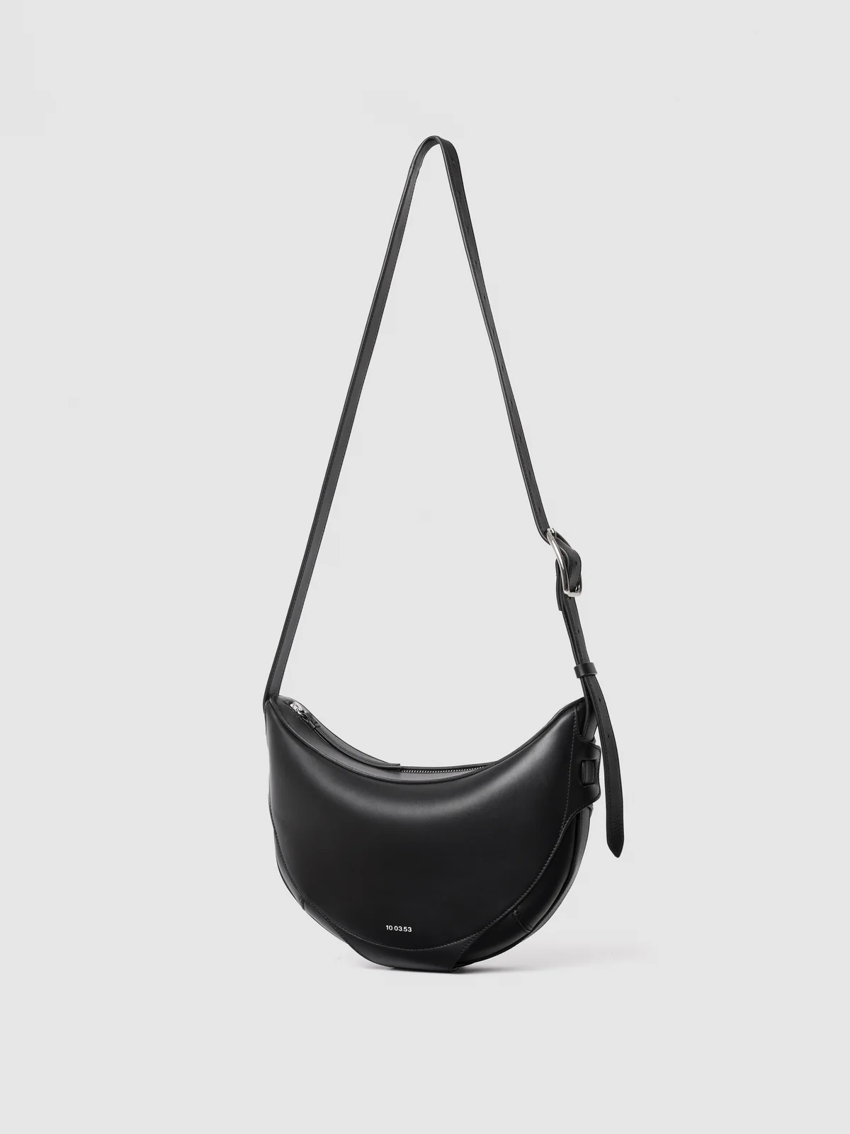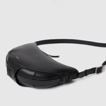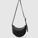 A nod to the 90s, this half-disk shape is inspired by the phases of the moon. Easy to carry by hand, on the shoulder, or as a crossbody. Zip closure. Adjustable and/or removable strap. Adjustable leather handle.