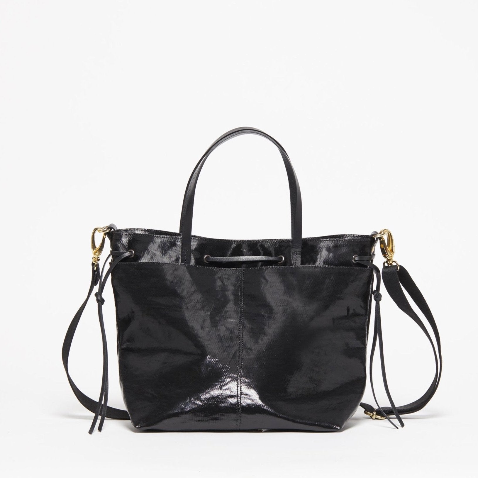 Carried by hand or on shoulder, Convertible from medium tote to bucket shape by pulling and tying side drawstring laces.