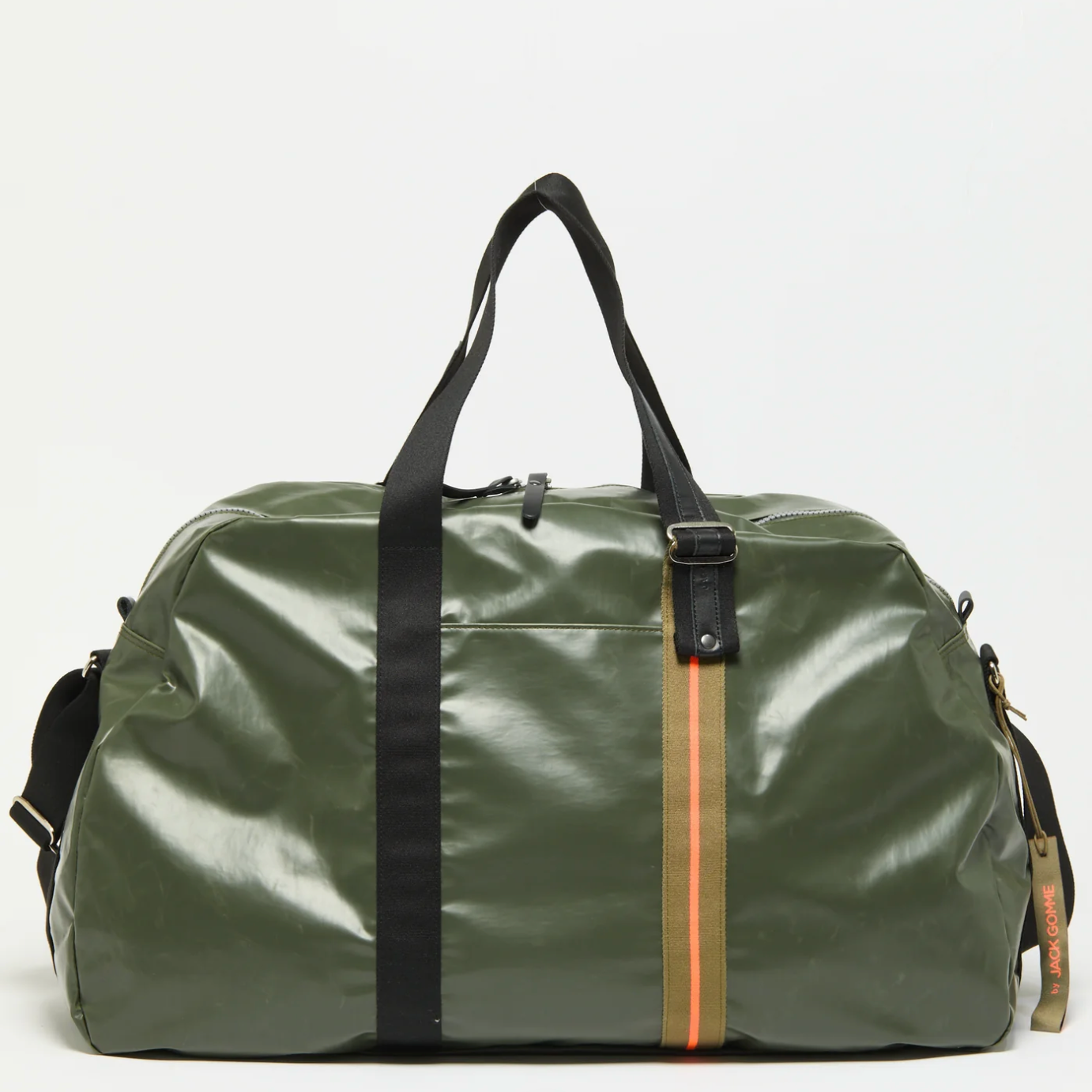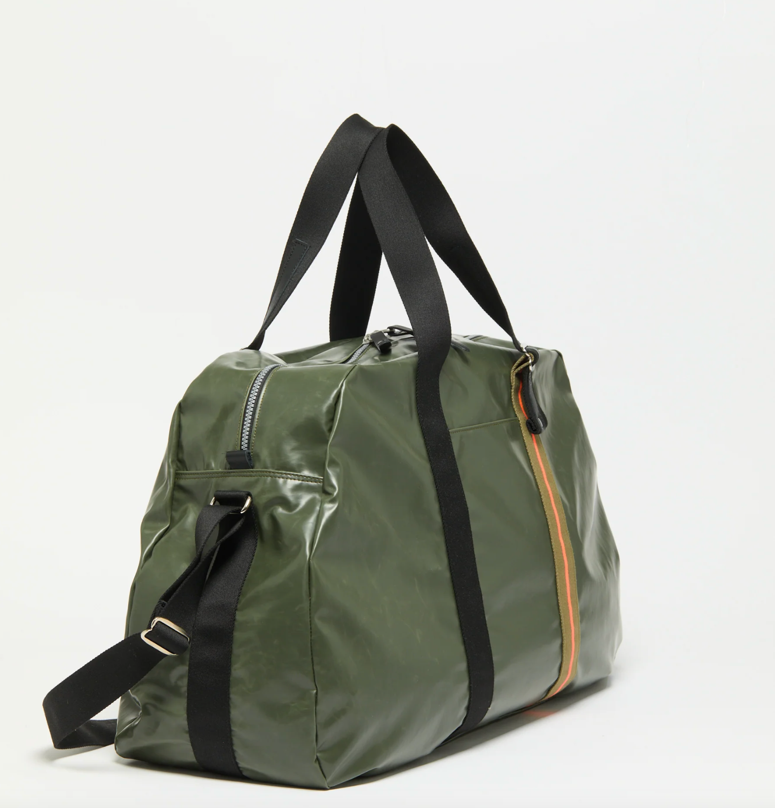 This incredibly light, extra large weekend bag folds completely flat for storage or is a convenient carry-on luggage piece. Zipper closure, attached shoulder strap