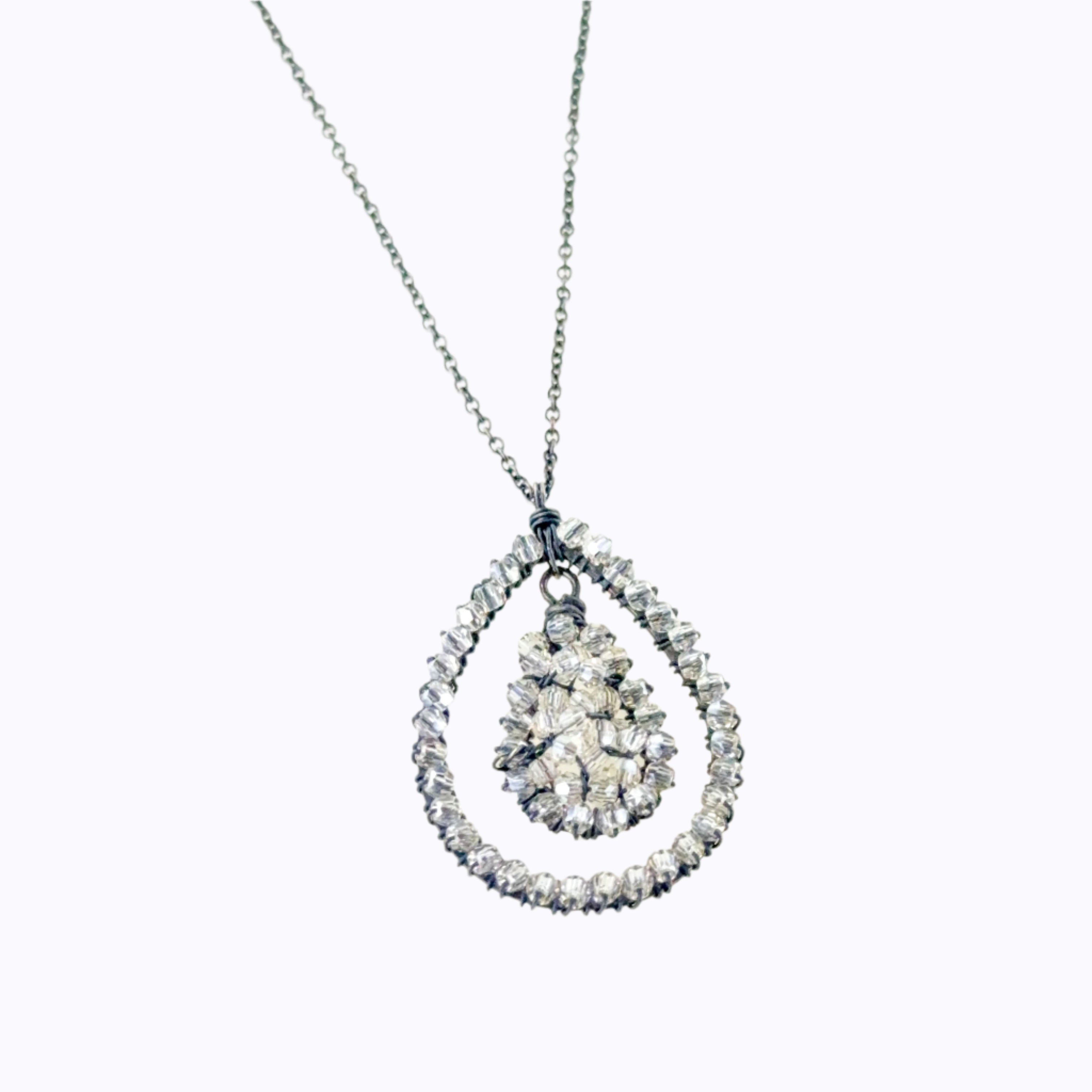 Dangling teardrop crystals in frame pendant of wire wrapped natural crystals. Handmade in the USA, featuring the intricacy of Dana Kellin's trademark wire-wrapping technique.