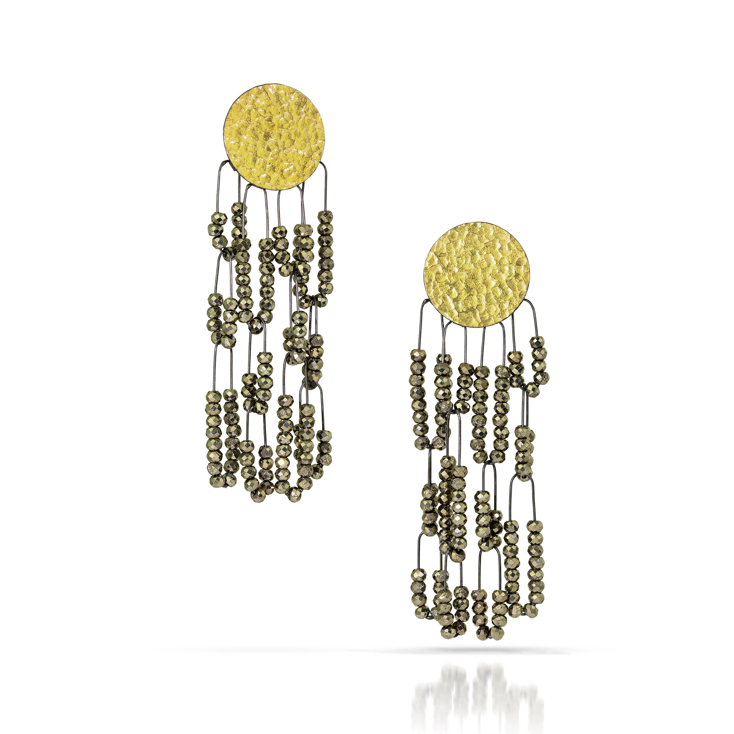 Dramatic yet so easy to wear, these earrings are inspired by art deco architecture and are hand fabricated with elongated oxidized sterling silver loops strung with tiny faceted pyrite stones that shimmer as they sway. The "luxe edition" post tops provide a luscious contrast with hand hammered 22k bimetal disks that sit comfortably against the ear. The earrings measure 3.25" long by 1" wide and have 14k posts. These are one of our best selling earrings that takes our clients from day to evening with sparkle and swing!