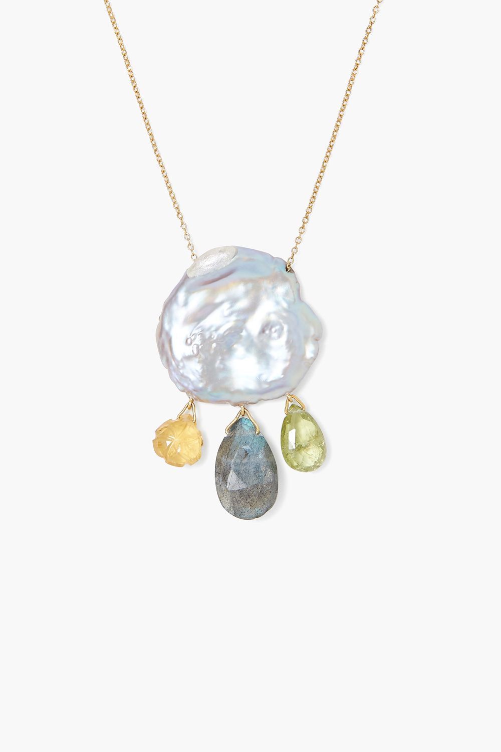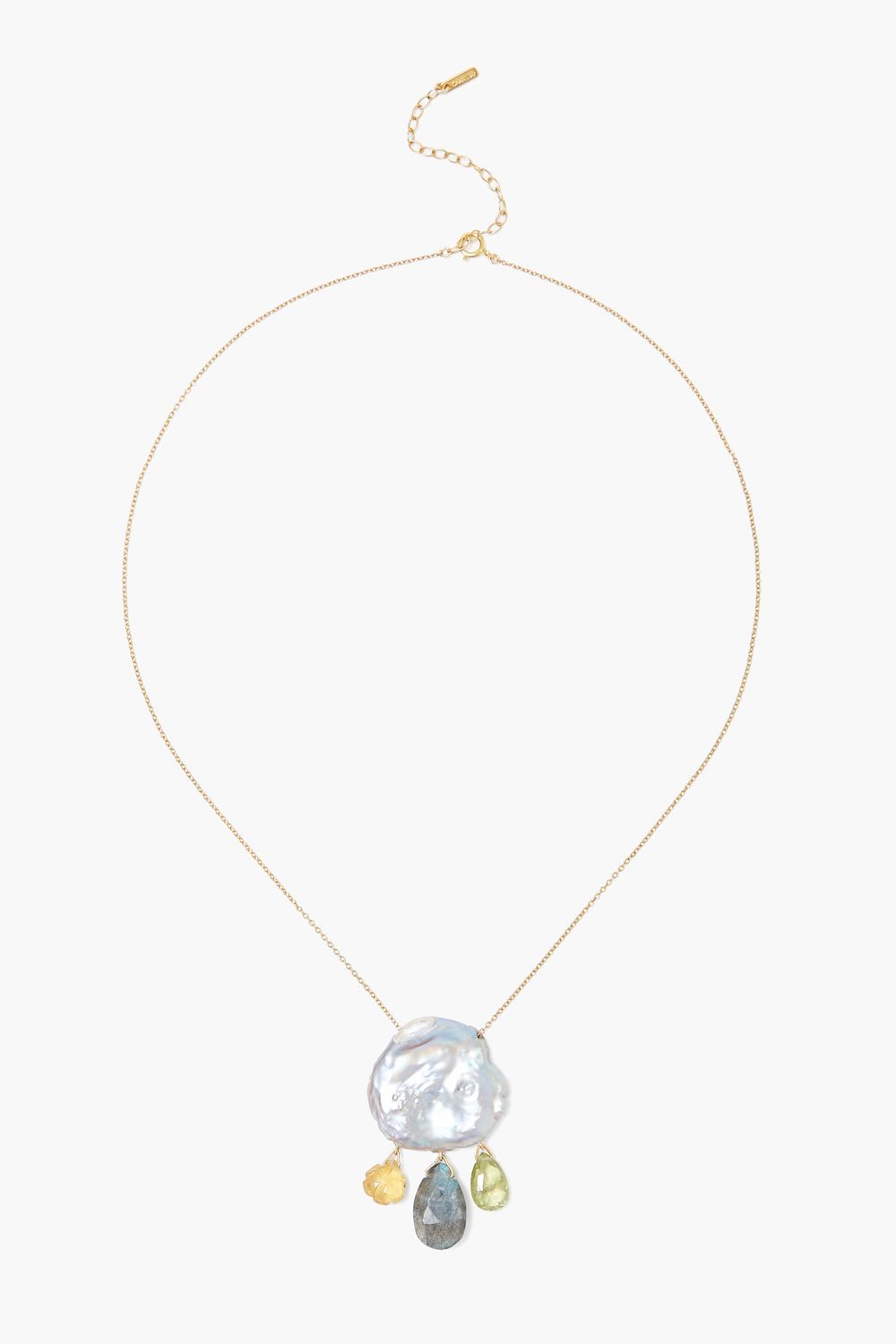 This eye-catching necklace features green garnet, labradorite and citrine suspended from a luminous silver grey keshi pearl strung on an 18k gold plated sterling silver chain. Fastens with a ring clasp closure.