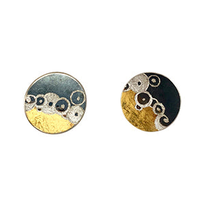 23k gold leaf fused on Fine Silver. oxidized. Sterling Silver ear post.