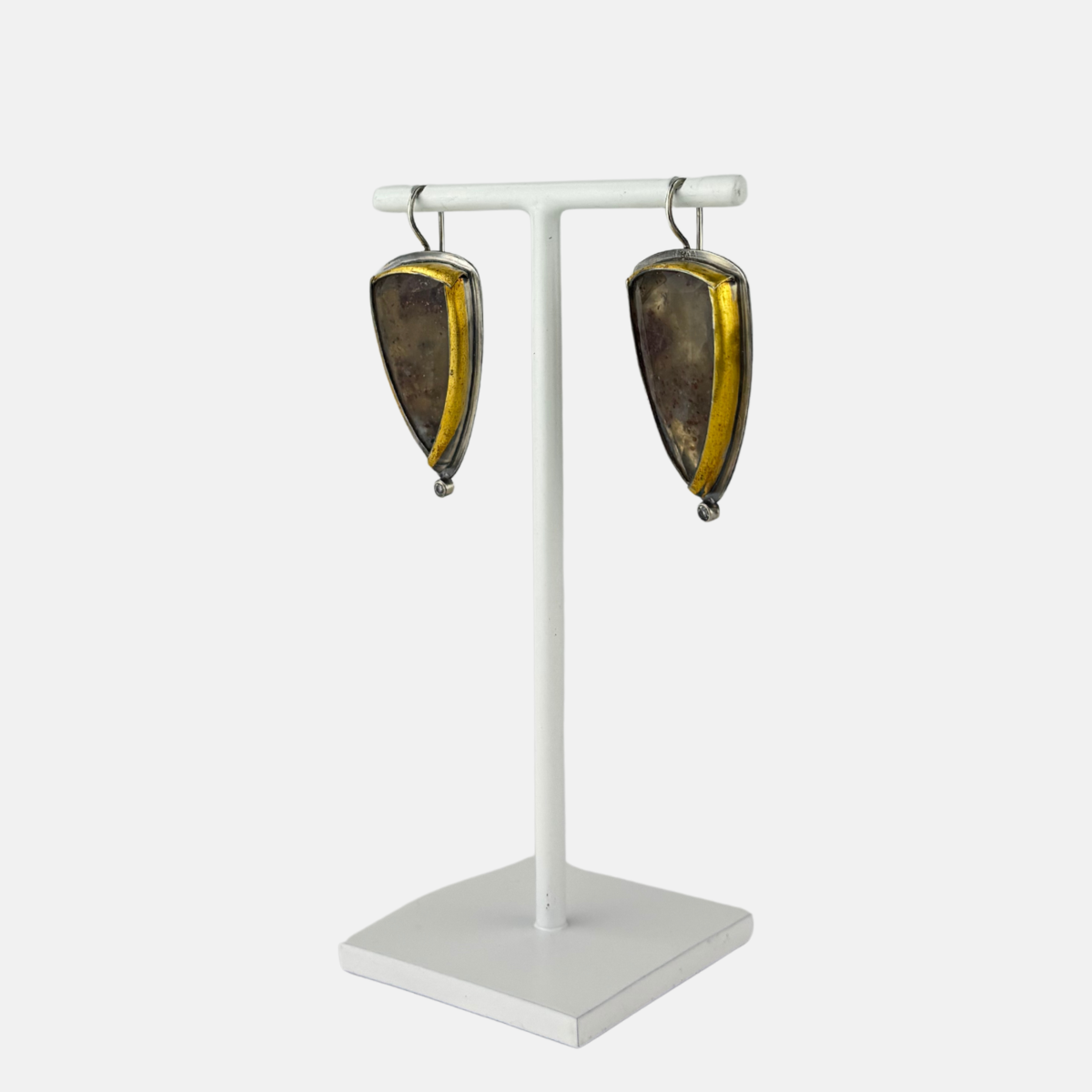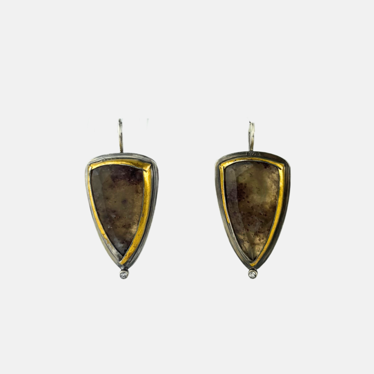 These large tri fold earrings offer a refined, smaller alternative featuring a rose-cut smokey agate stone accented by a delicate 1.5mm diamond. Crafted from oxidized sterling silver with 24k gold highlights, they balance sophistication with durability. The secure hook closure ensures they stay comfortably in place.