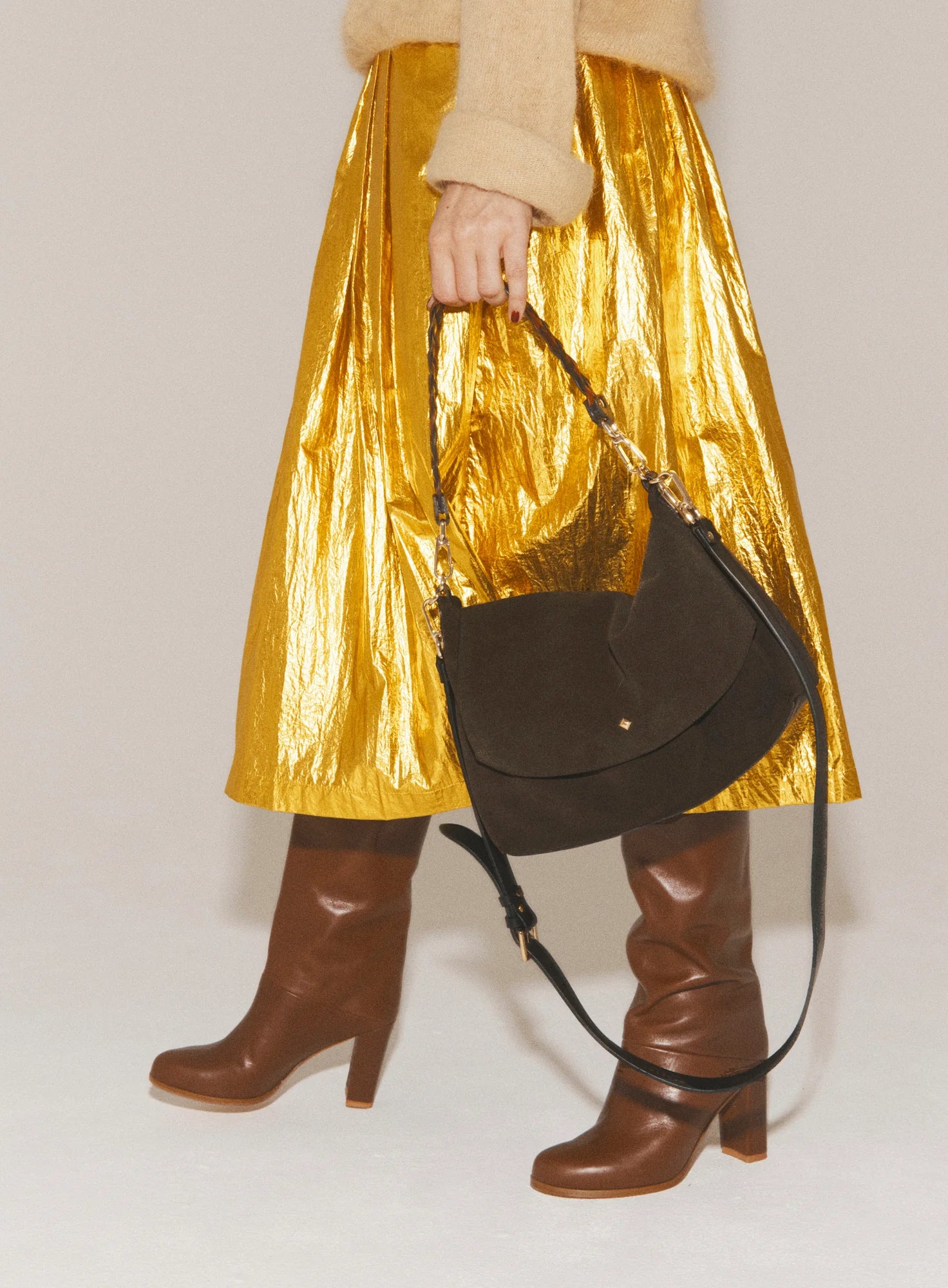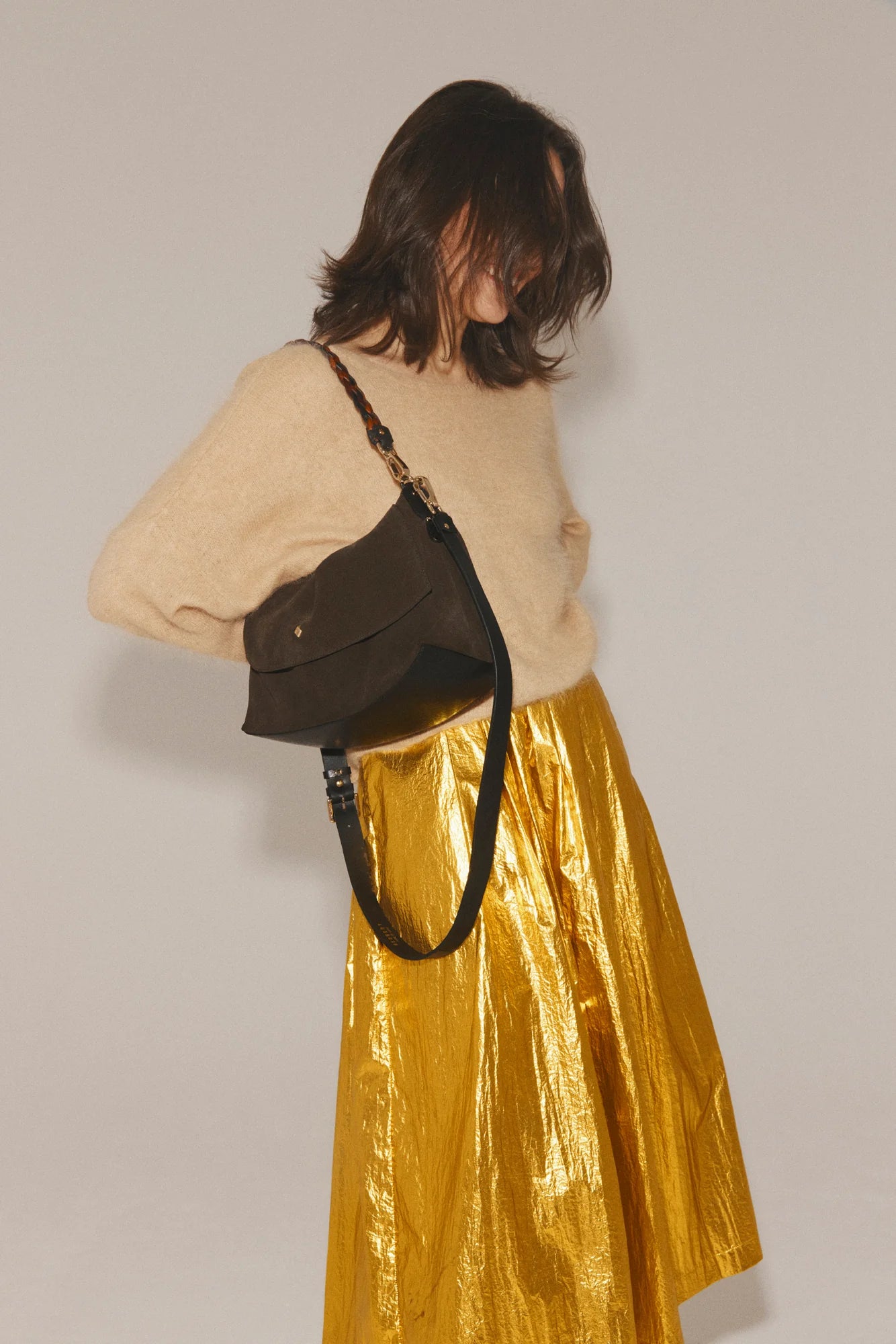 This slouchy suede beauty not only adds a touch of luxury to any outfit, but also comes with an additional crossbody strap for versatile use. The soft material and braided handle make it both comfortable and chic. Upgrade your wardrobe with this must-have accessory!