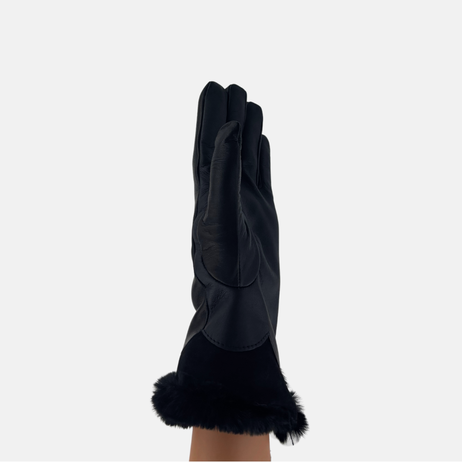 Stay cozy and stylish with these mid length Napa (lamb) leather gloves with soft 100% cashmere lining and a faux fur trim. The trim for the first 2" to keep the wind out from coats with cropped sleeves. The tops of the gloves can be turned out for an extra furry look. Leather is pre-treated with nanotech to make it smartphone and touchscreen compatible.