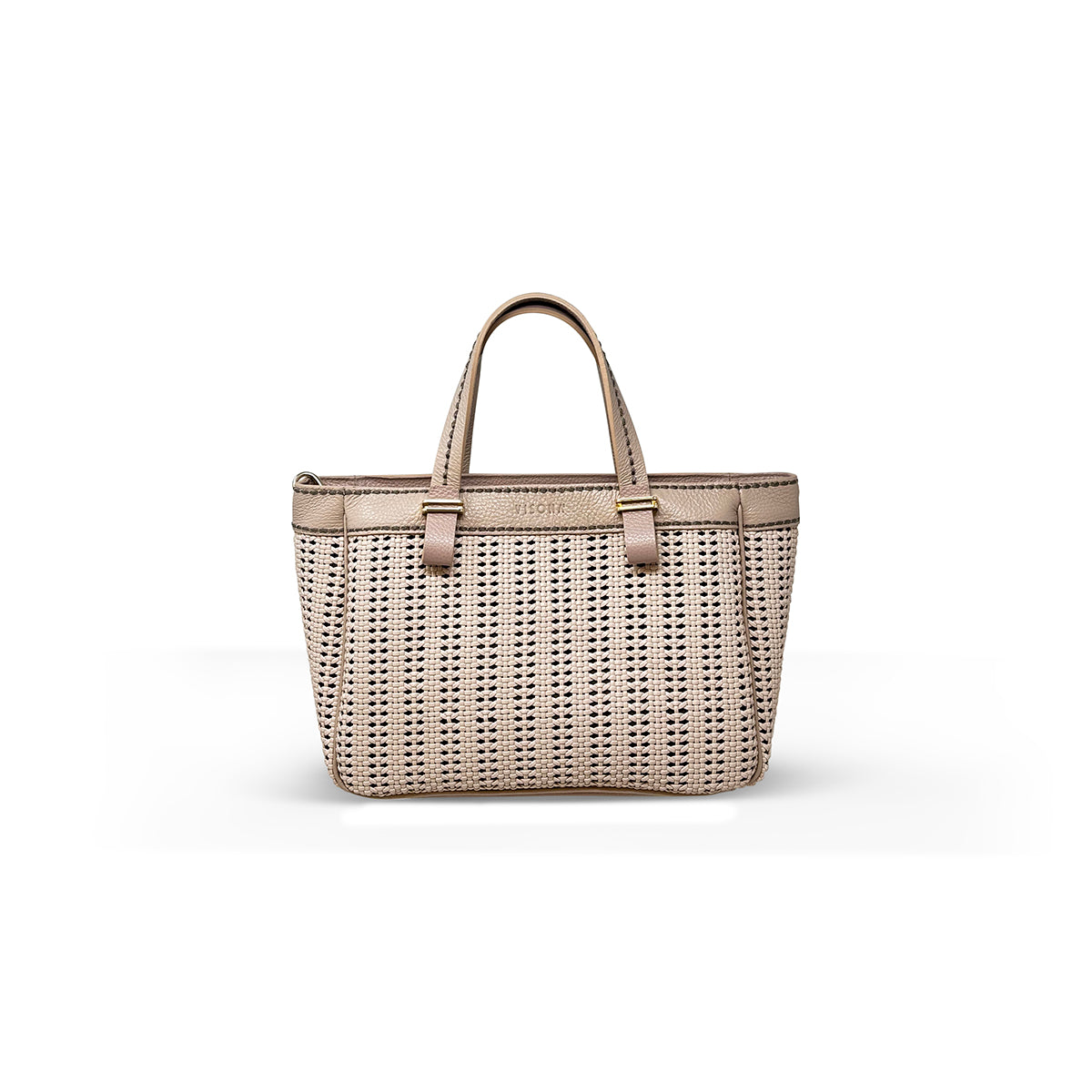 Classic handheld tote body shape constructed in an embossed leather gives the illusion of a classic woven straw bag but light, flexible and durable.