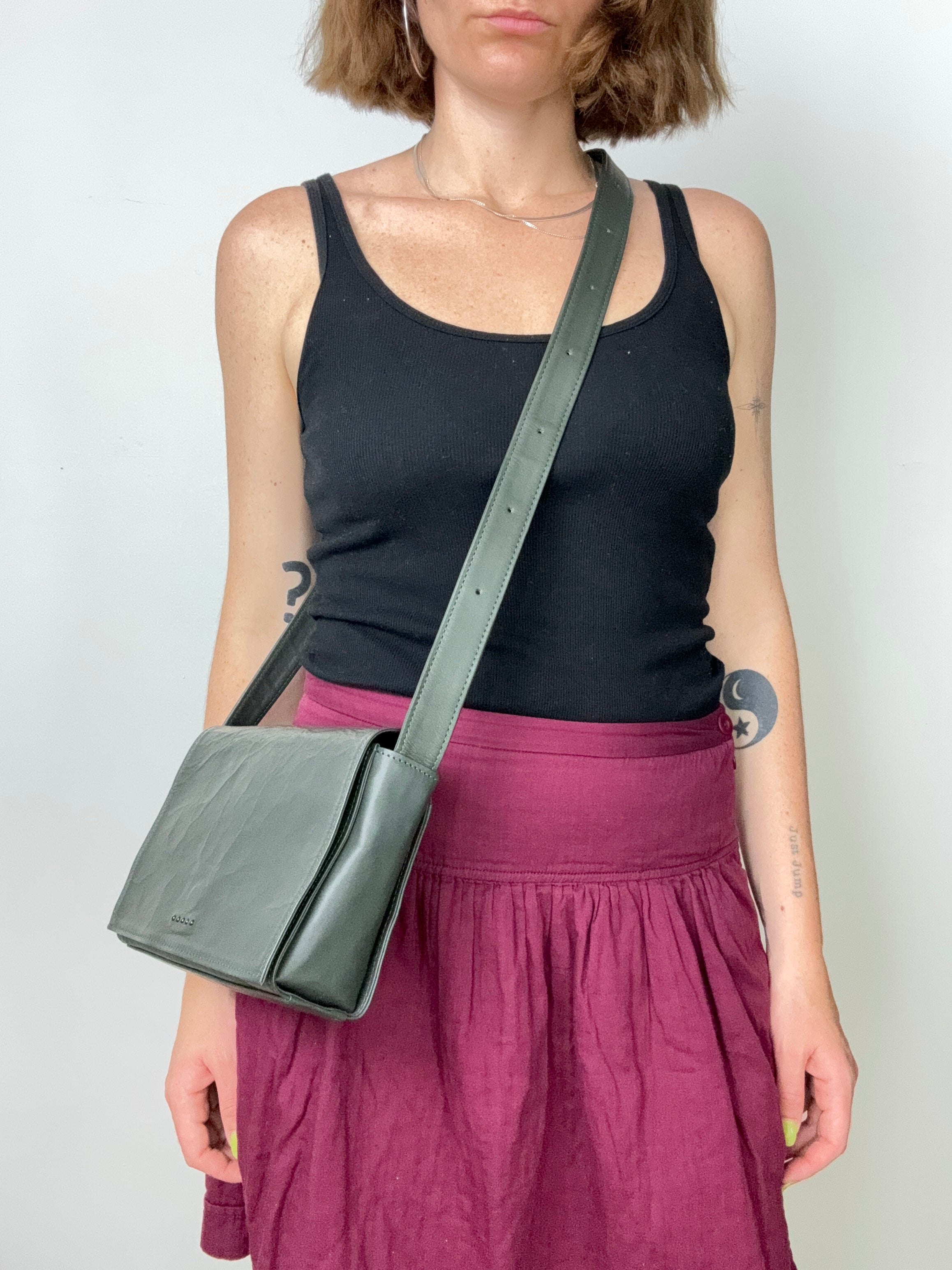 Adjustable shoulder belt strap, magnet closure on flap, outside slip pocket fits large cell phones, interior small zip pocket