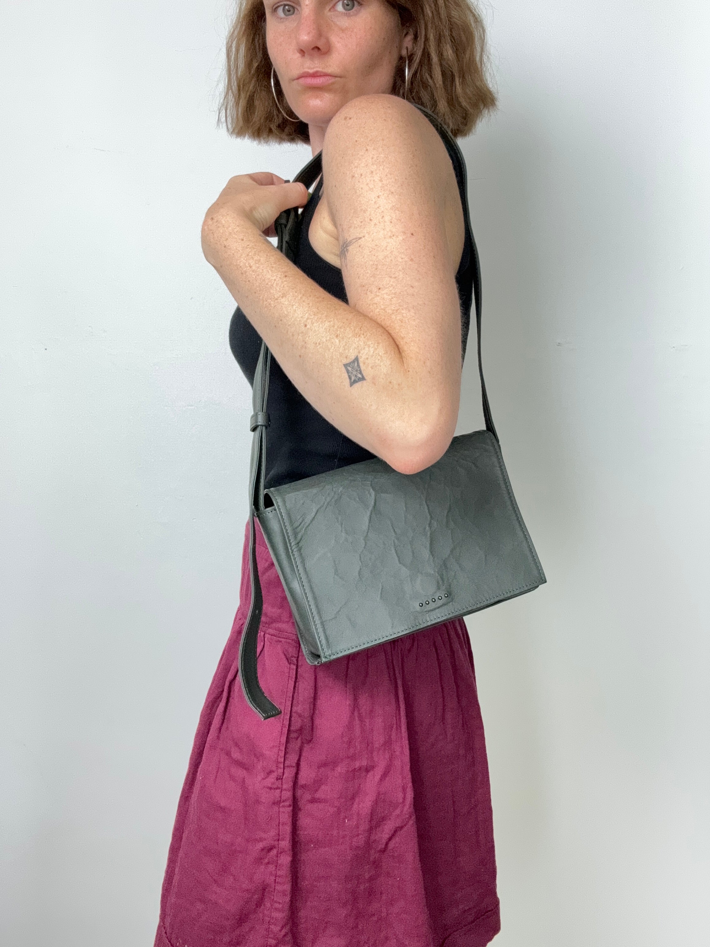 This bag is made from a special material called `crinkle leather', which is made by slicing strong fibers of tanned leather to the thinnest thickness (0.5mm) that will leave a rough surface, and bonding aluminum foil to the back of the slices.