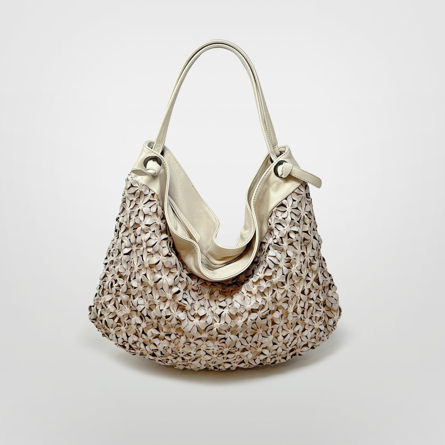 Beautiful Laser Cut geometric flower shapes lighten the texture and weight of a super soft calf skin leather.