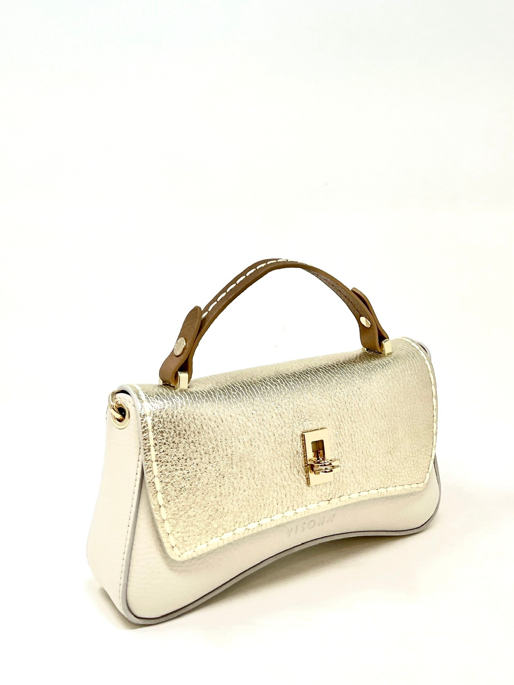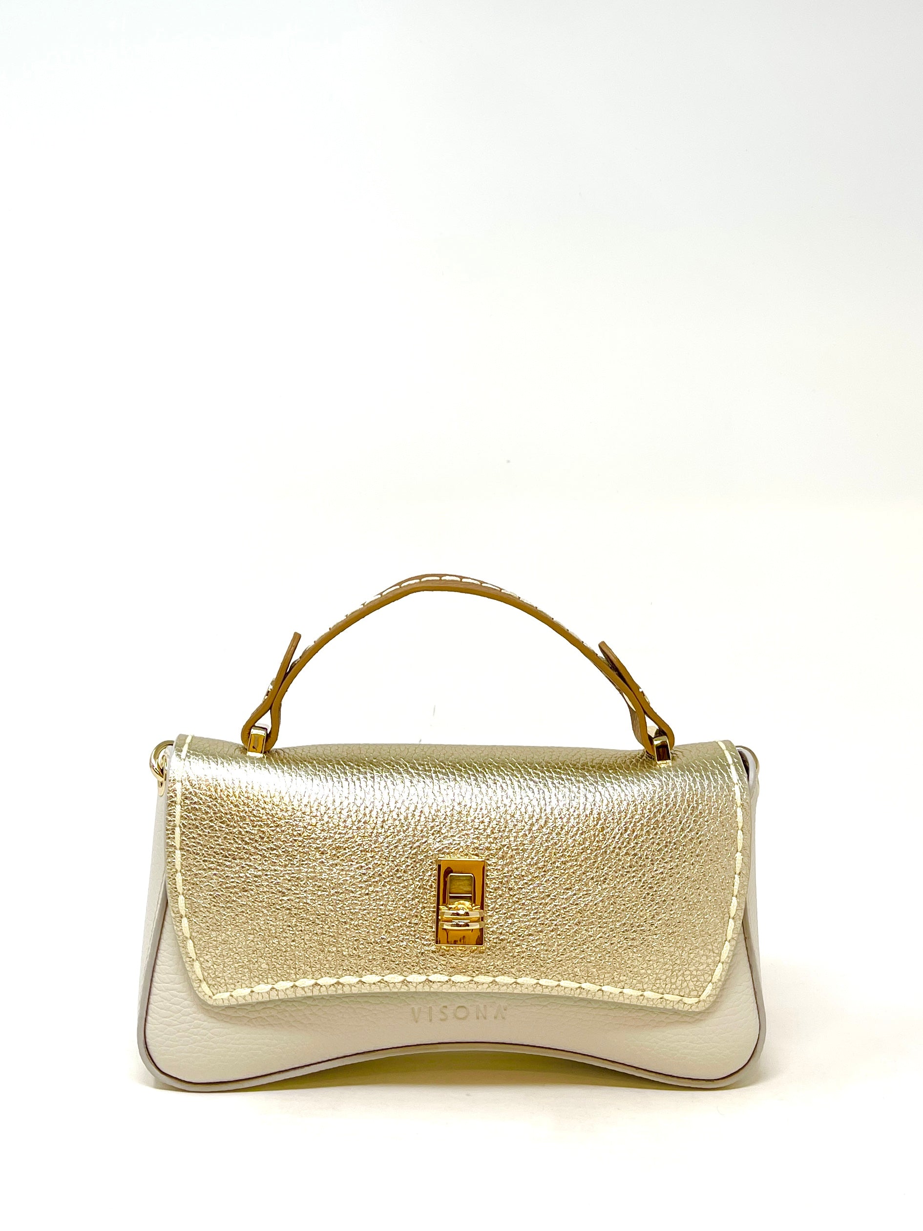Plinio Visona Beige and Gold Contrast Flap Clutch with Shoulder Strap