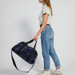 Our bestselling overnight/gym/ carry on bag. Can be worn on the shoulder like a tote or across the body using the detachable strap for hands free use. Convenient deep outside pocket fits a water bottle or umbrella.