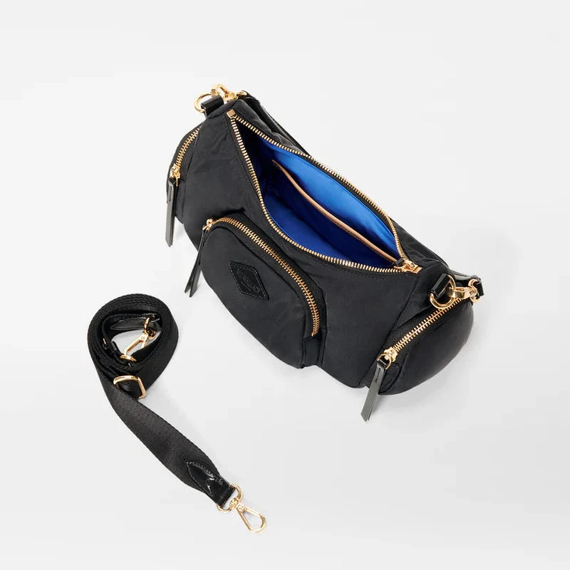 - Detachable, adjustable nylon crossbody strap