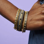 With a signature gold and black finish, along with pops of sparkling handset pavé, this stacking bangle shines with empowered edge. Rhodium window details create a two-toned mixed metal look that is timeless.