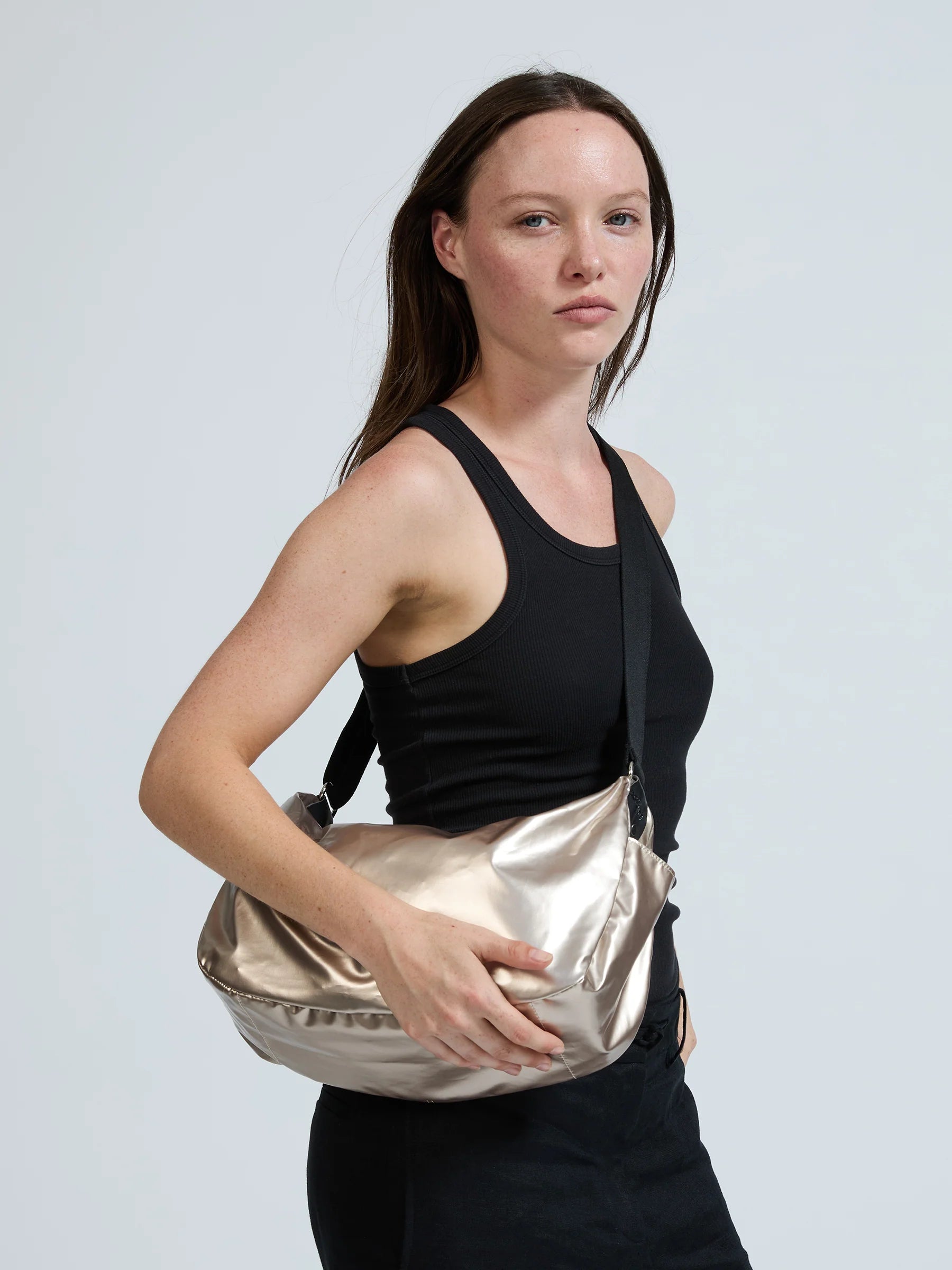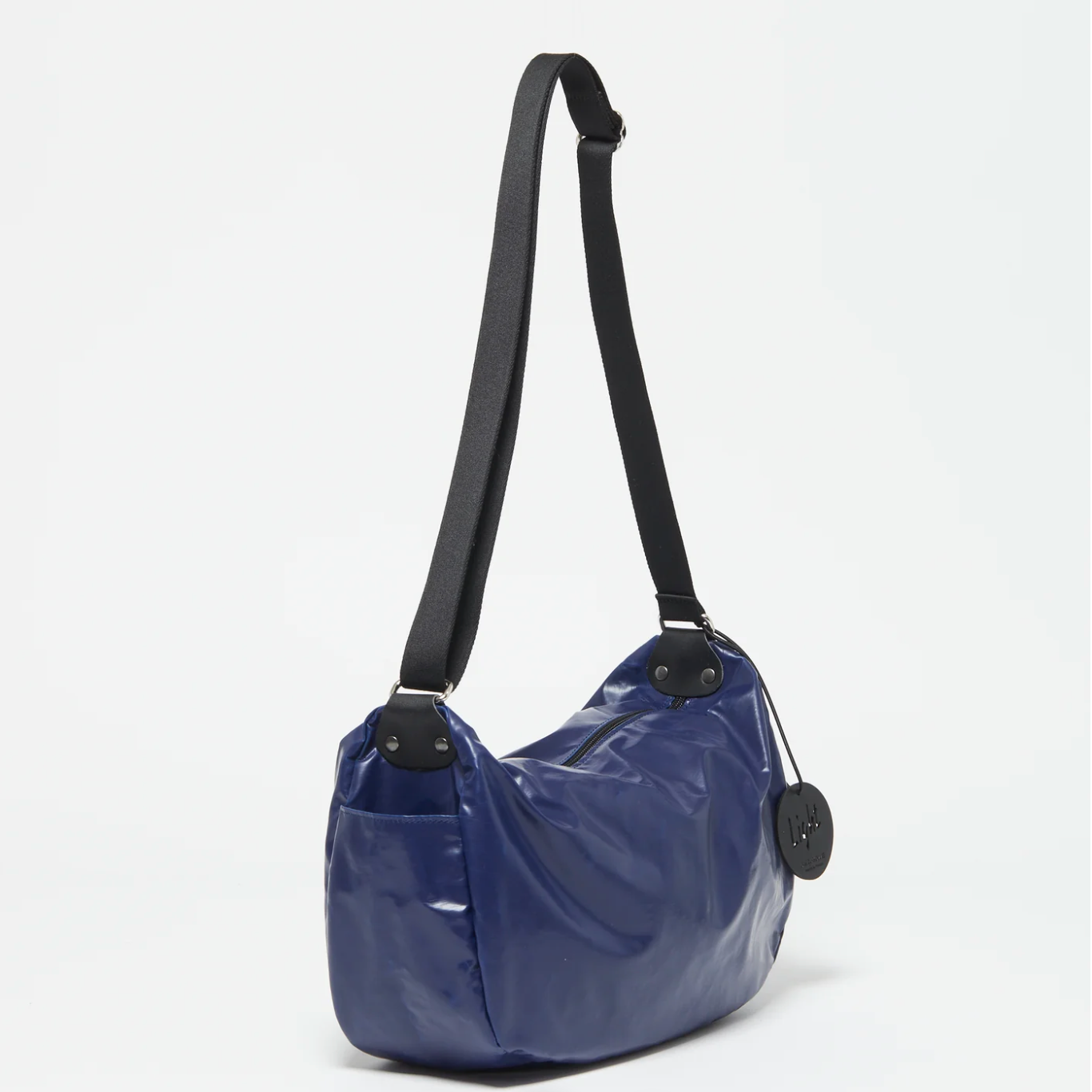 A truly useful shape for handsfree life. Can be carried on the shoulder or made crossbody with the slide of the buckle. The shape transforms depending on how much is put inside which makes this one of Jack Gomme's most enduring silhouettes in its popular Light line. A great size for your carrying your daily essentials and then that unexpected extra scarf or book.