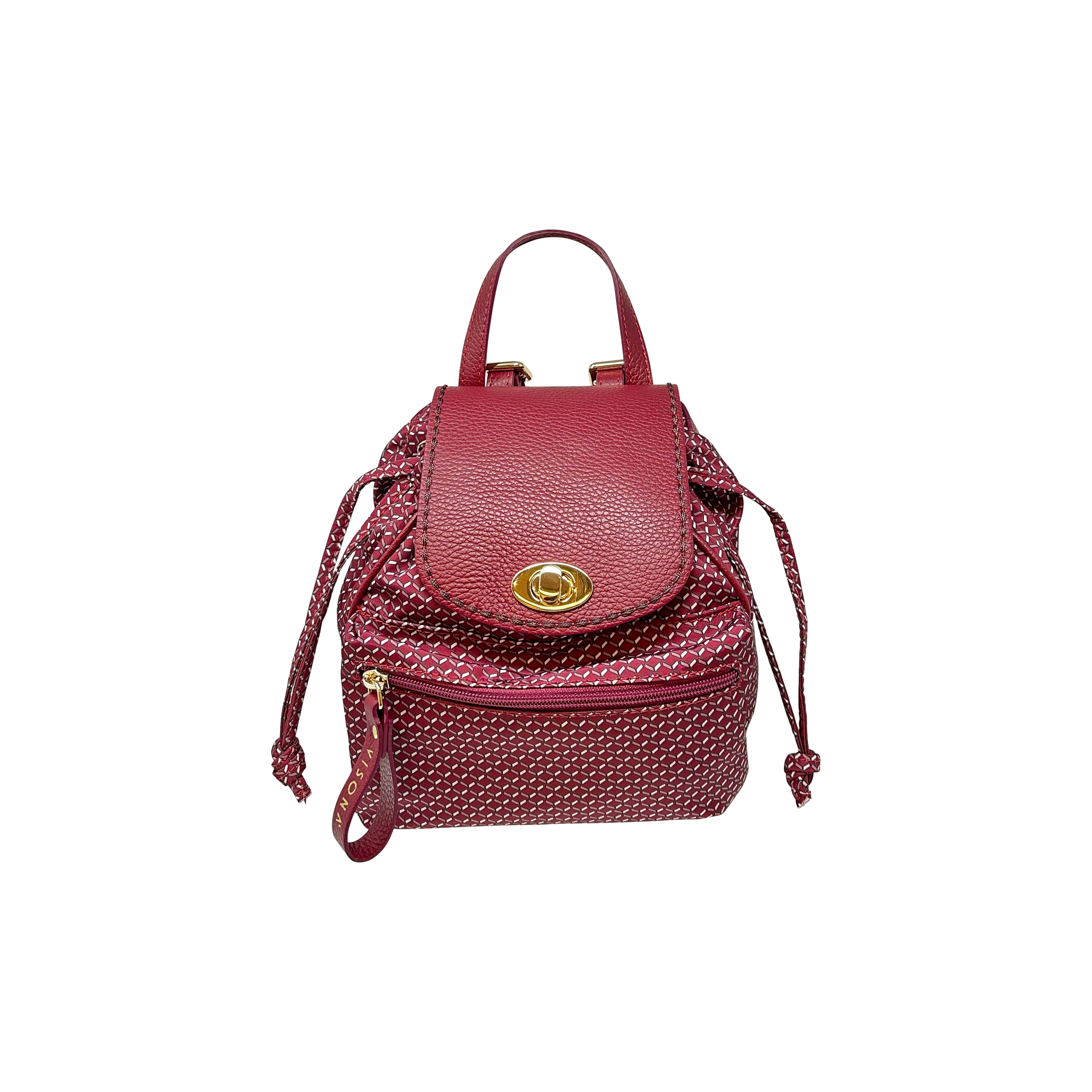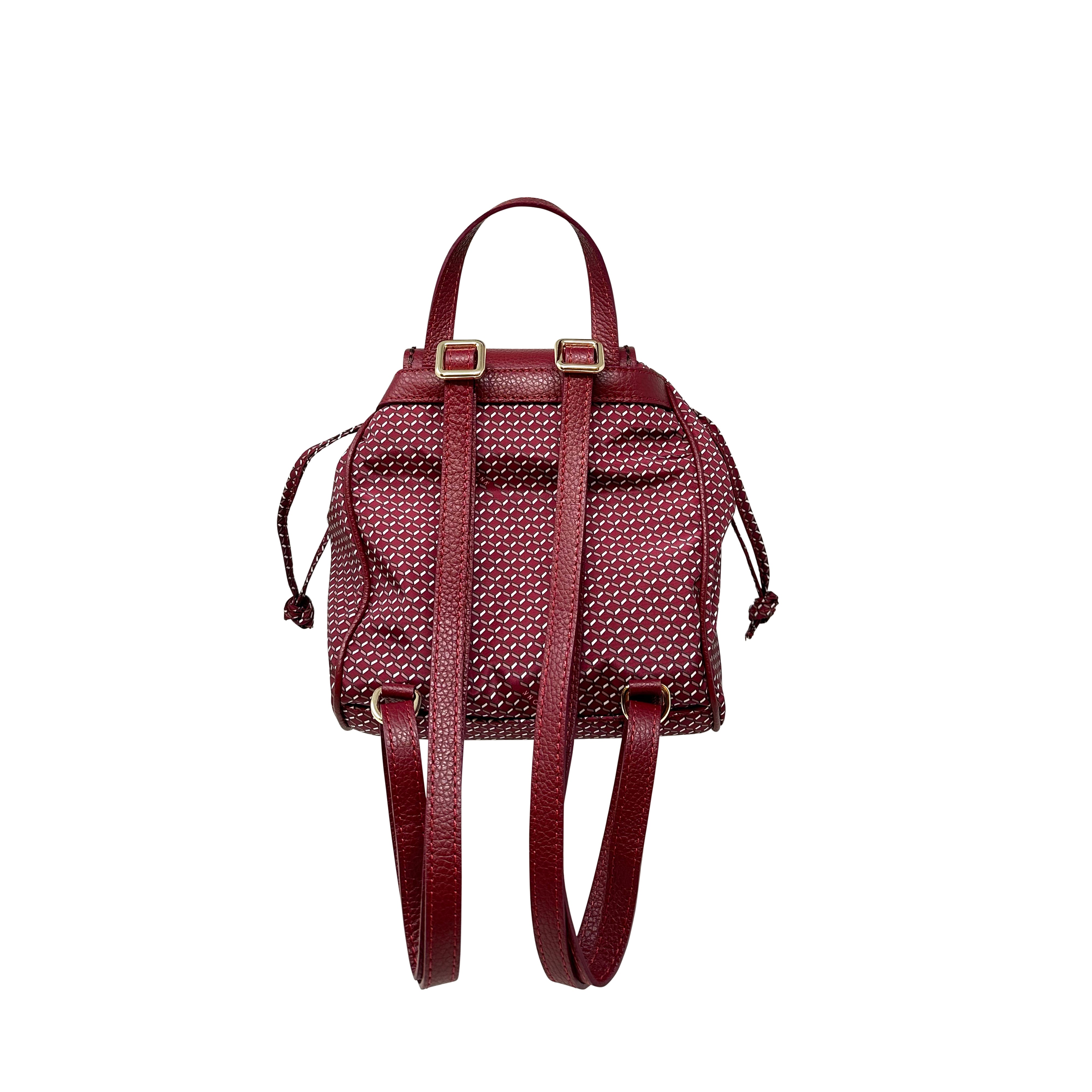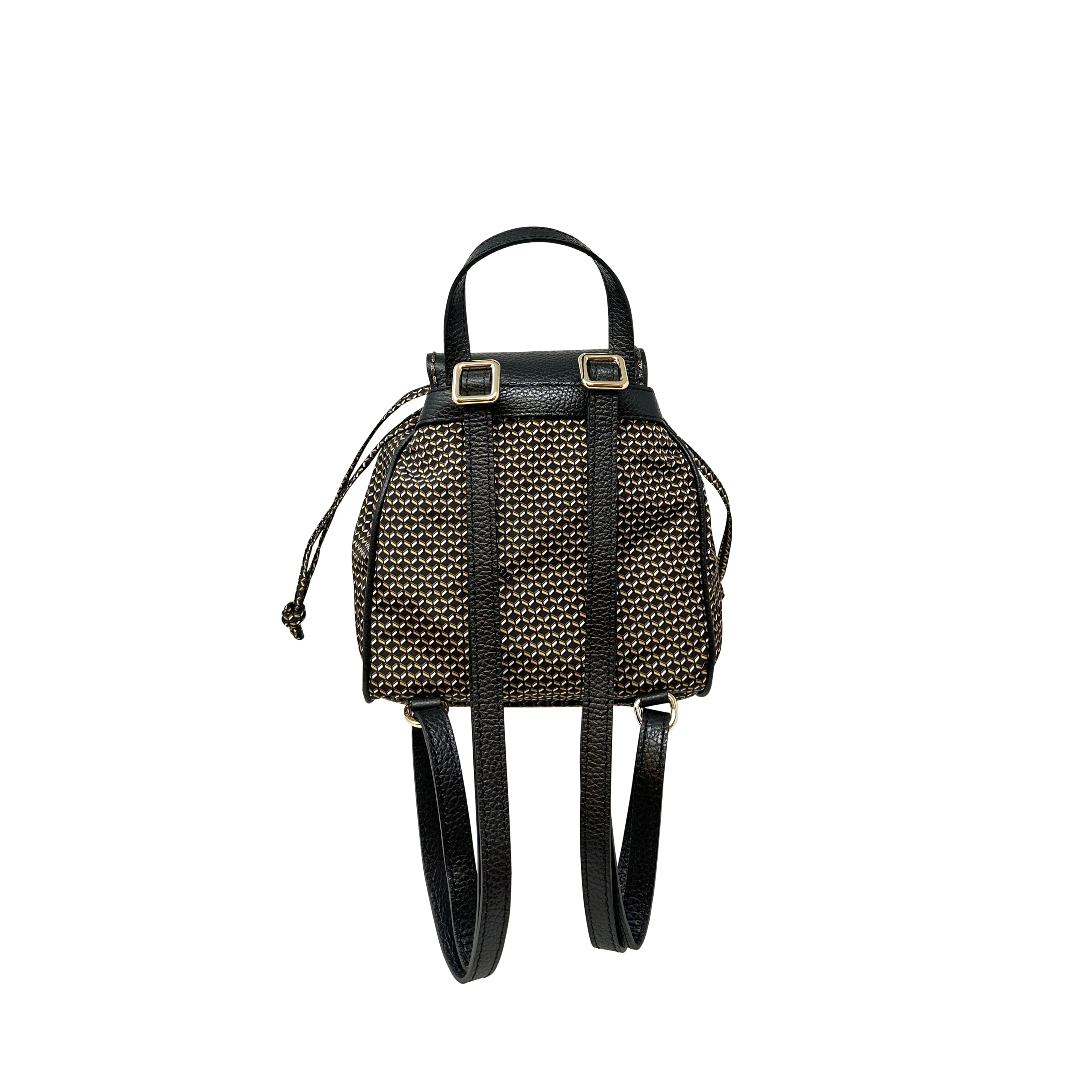 a small backpack in the uniquely lightweight and resistant exclusive PLINIO fabric with full Italian leather trim for durability and elegance. PLINIO Practicality: the subtle 3 tone print creates an illusion of 1 color but makes it neutral for a variety of tones and hides dirt and use over time.