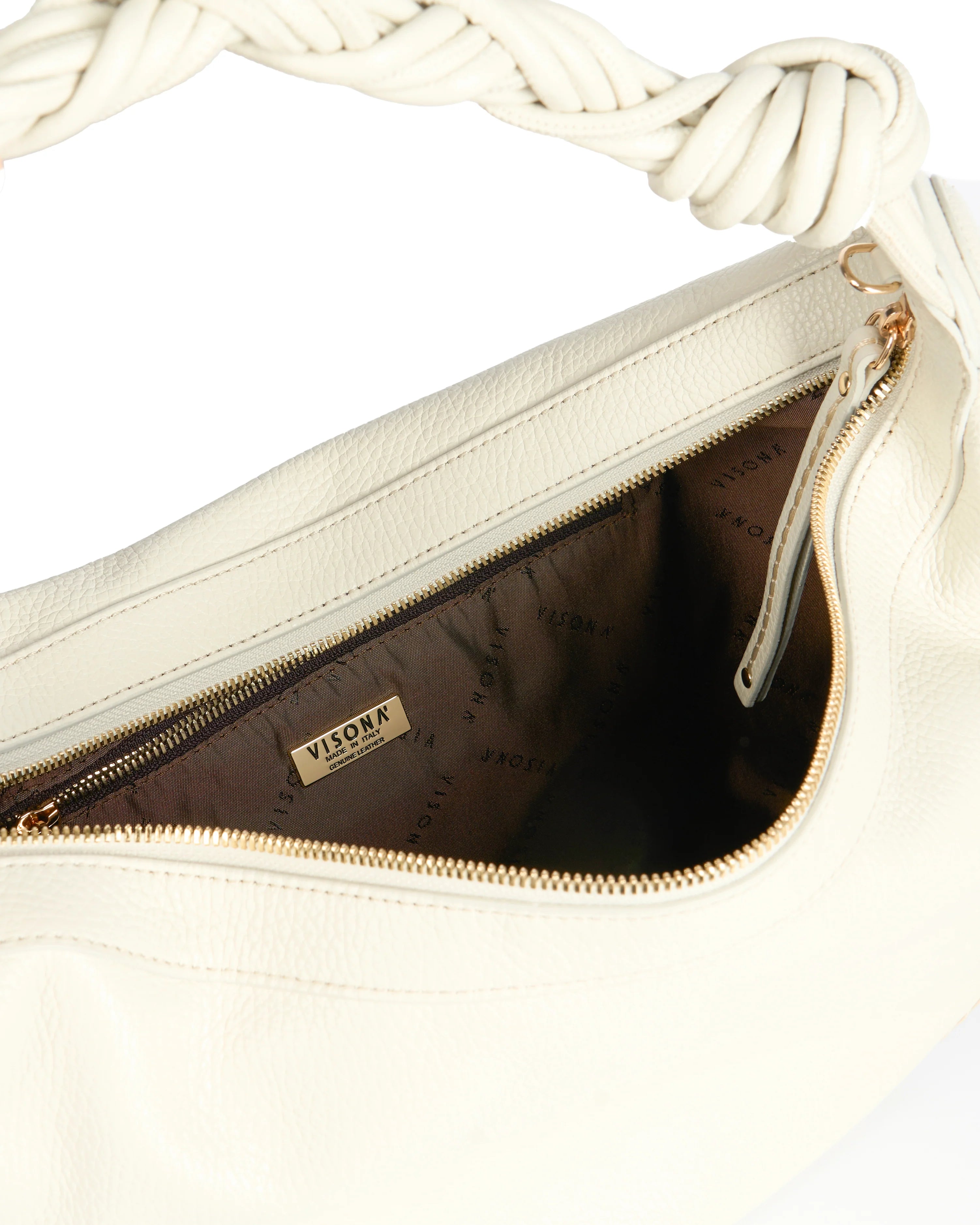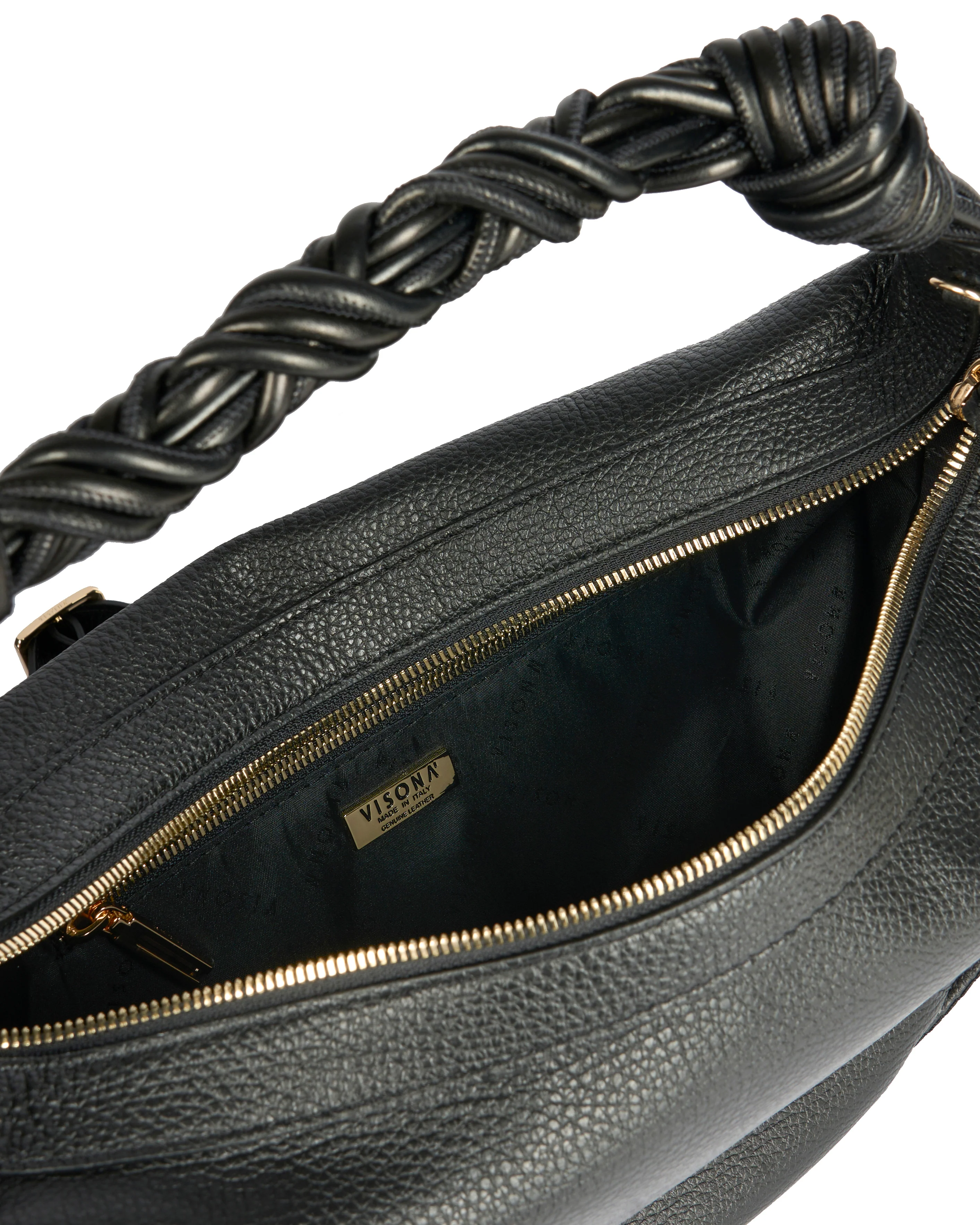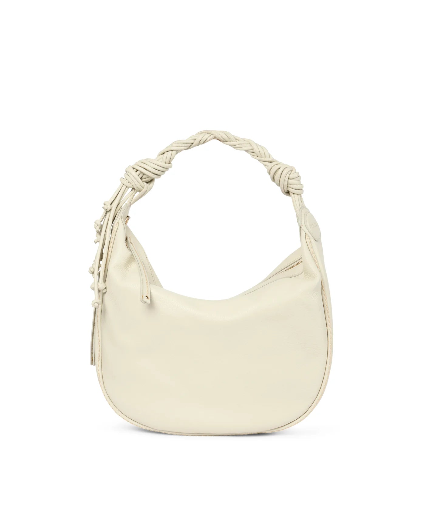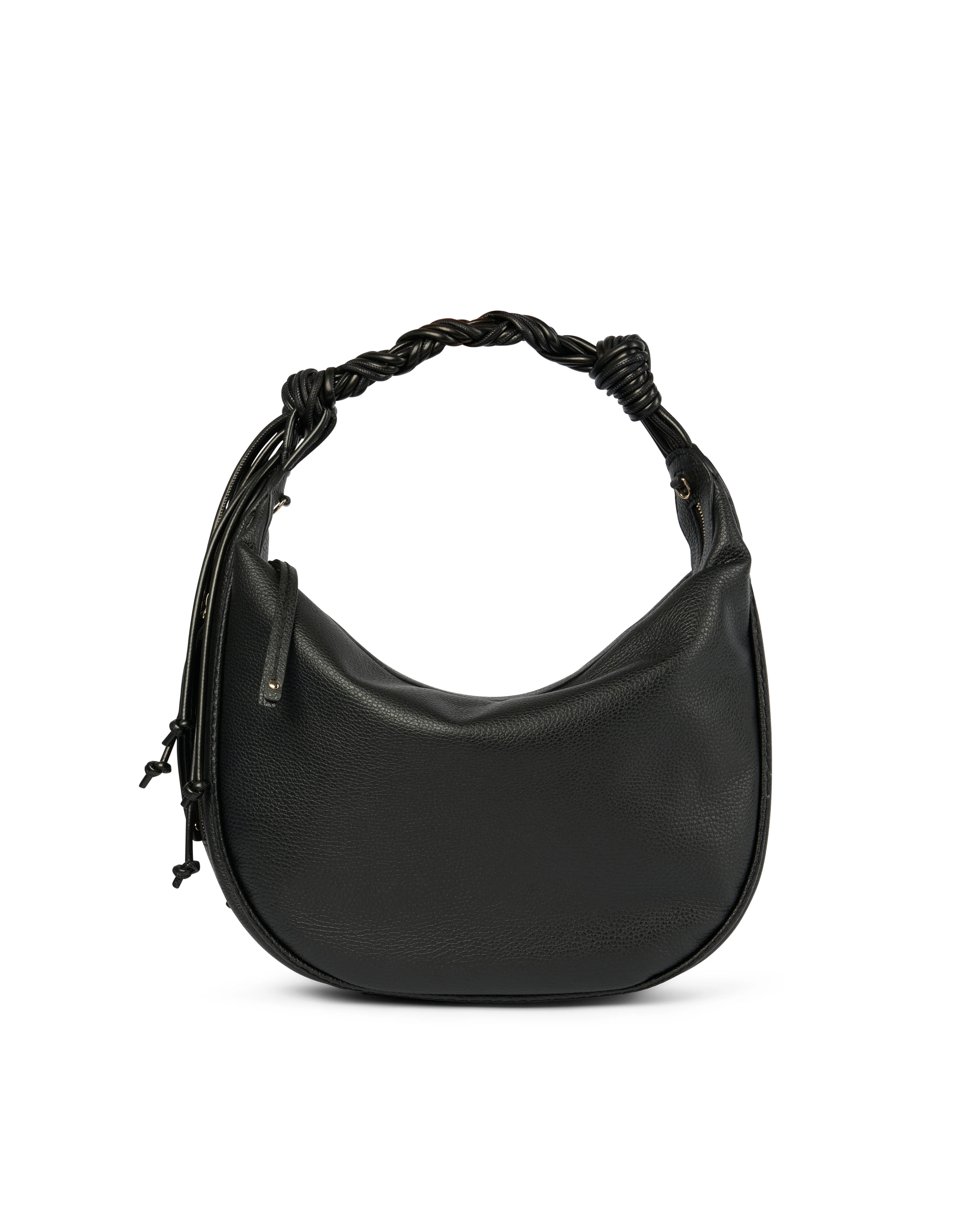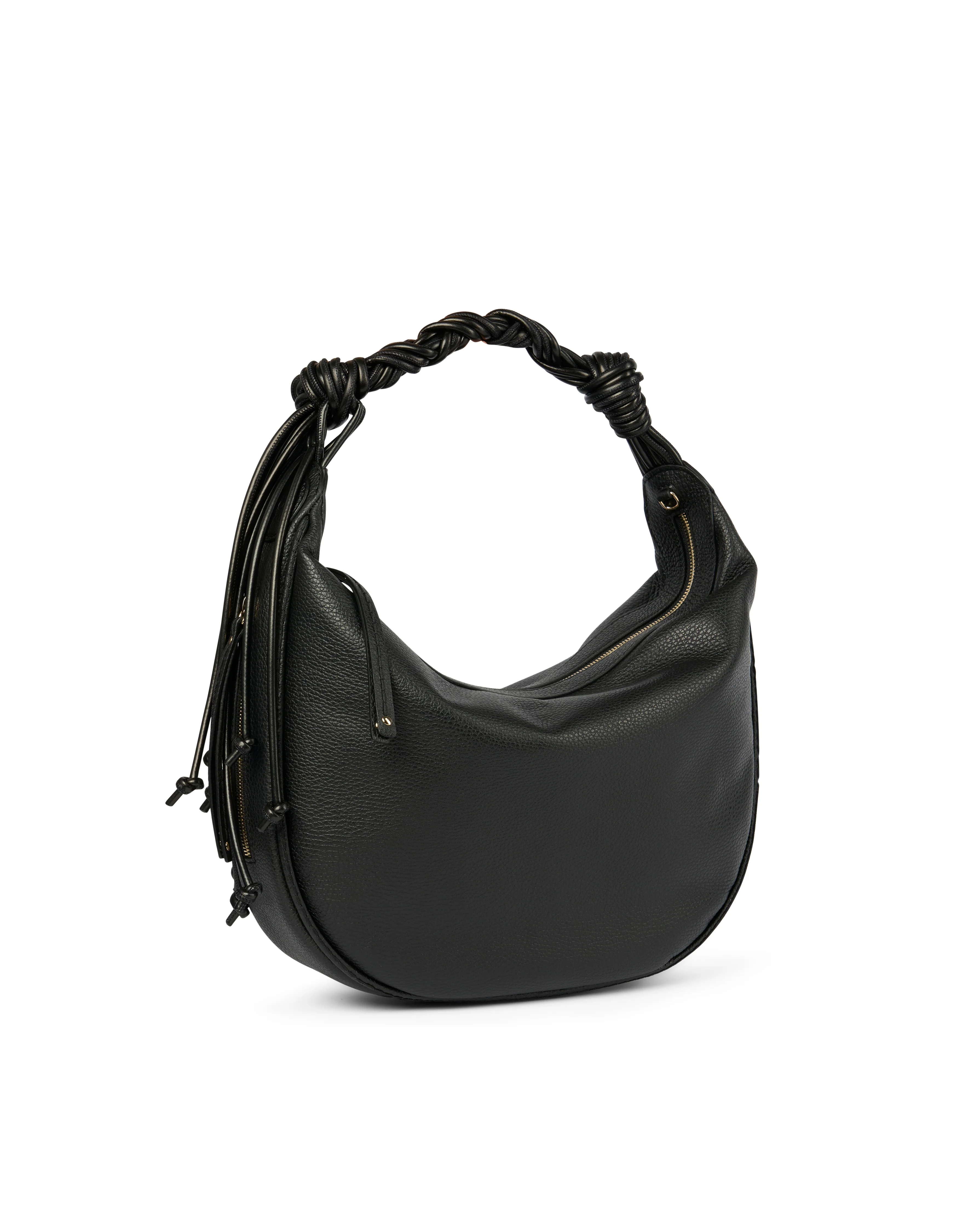 Medium size hobo with braided strap and tassel. Zippered outside pocket on the side externally, as well as a zippered inside pocket and two internal slip in pockets.