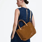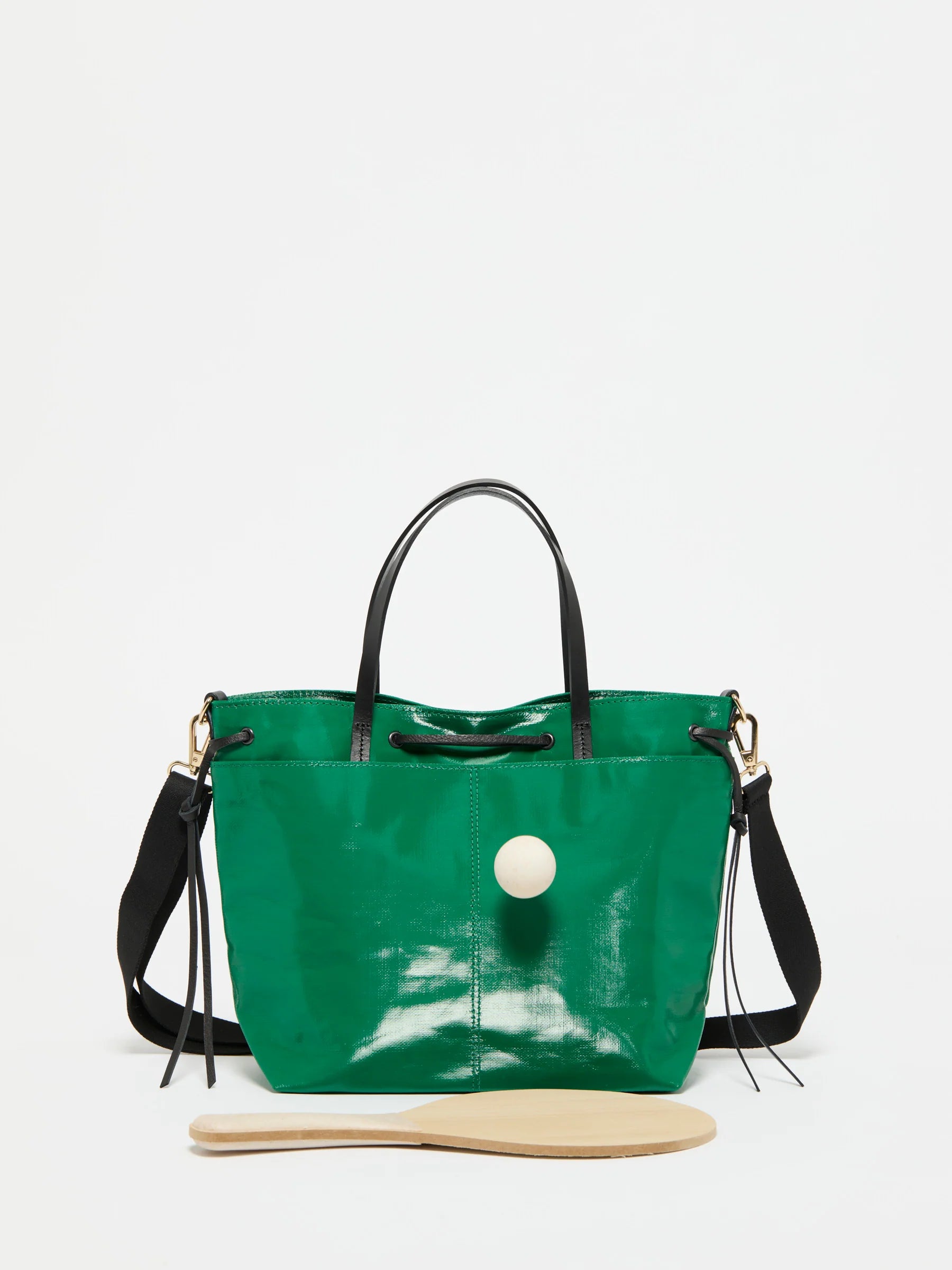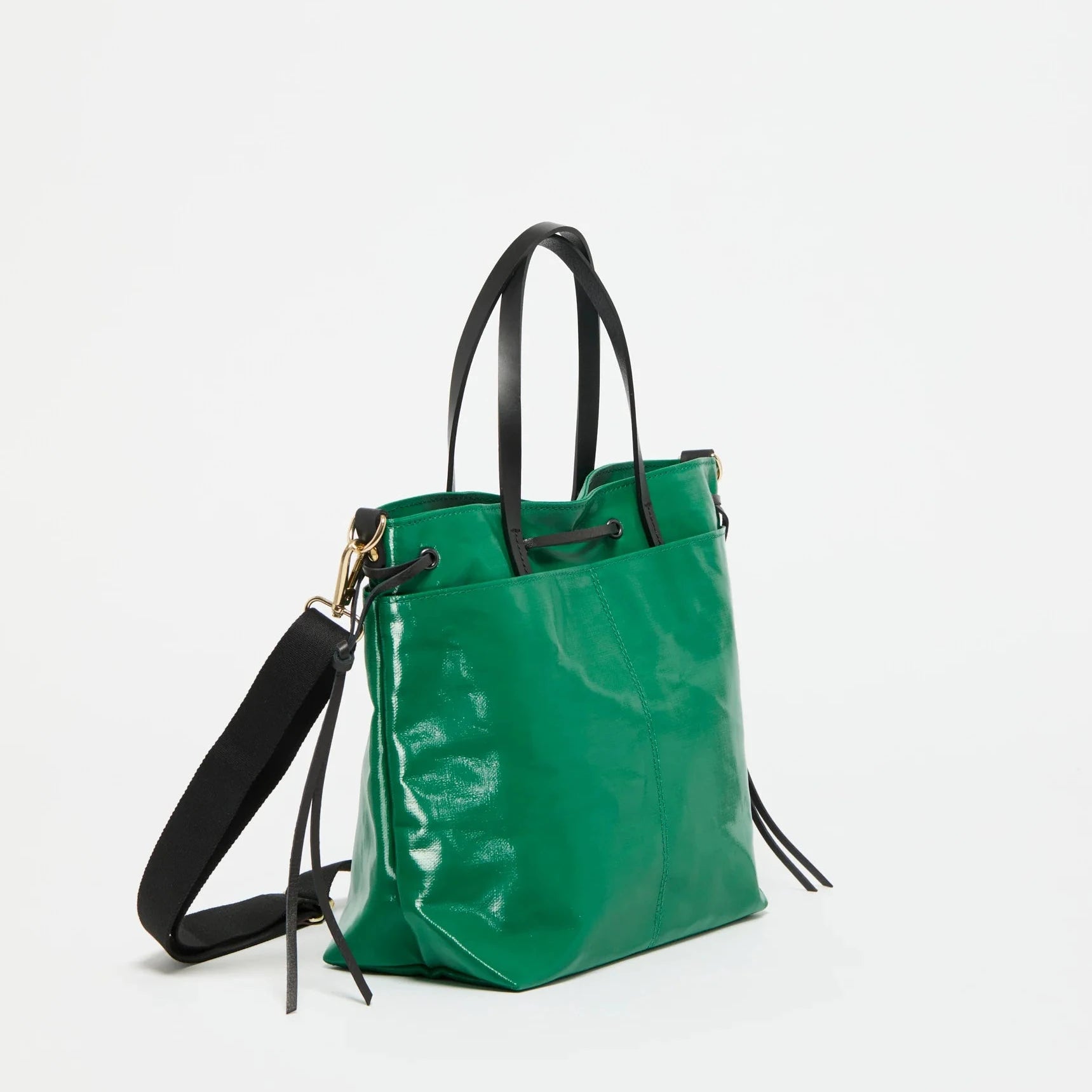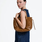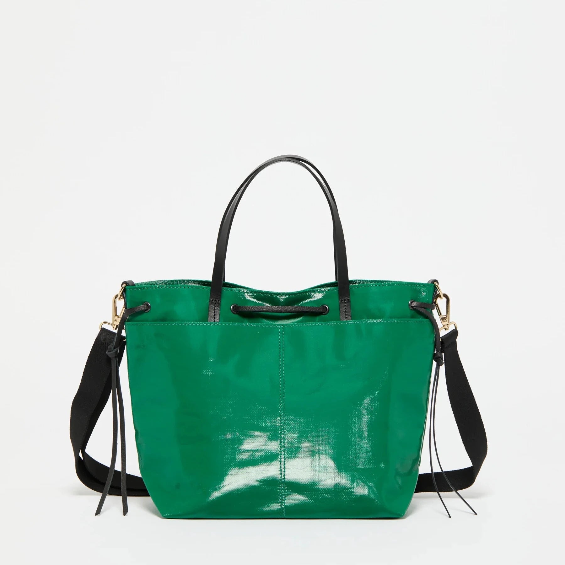 Carried by hand or on shoulder, Convertible from medium tote to bucket shape by pulling and tying side drawstring laces.