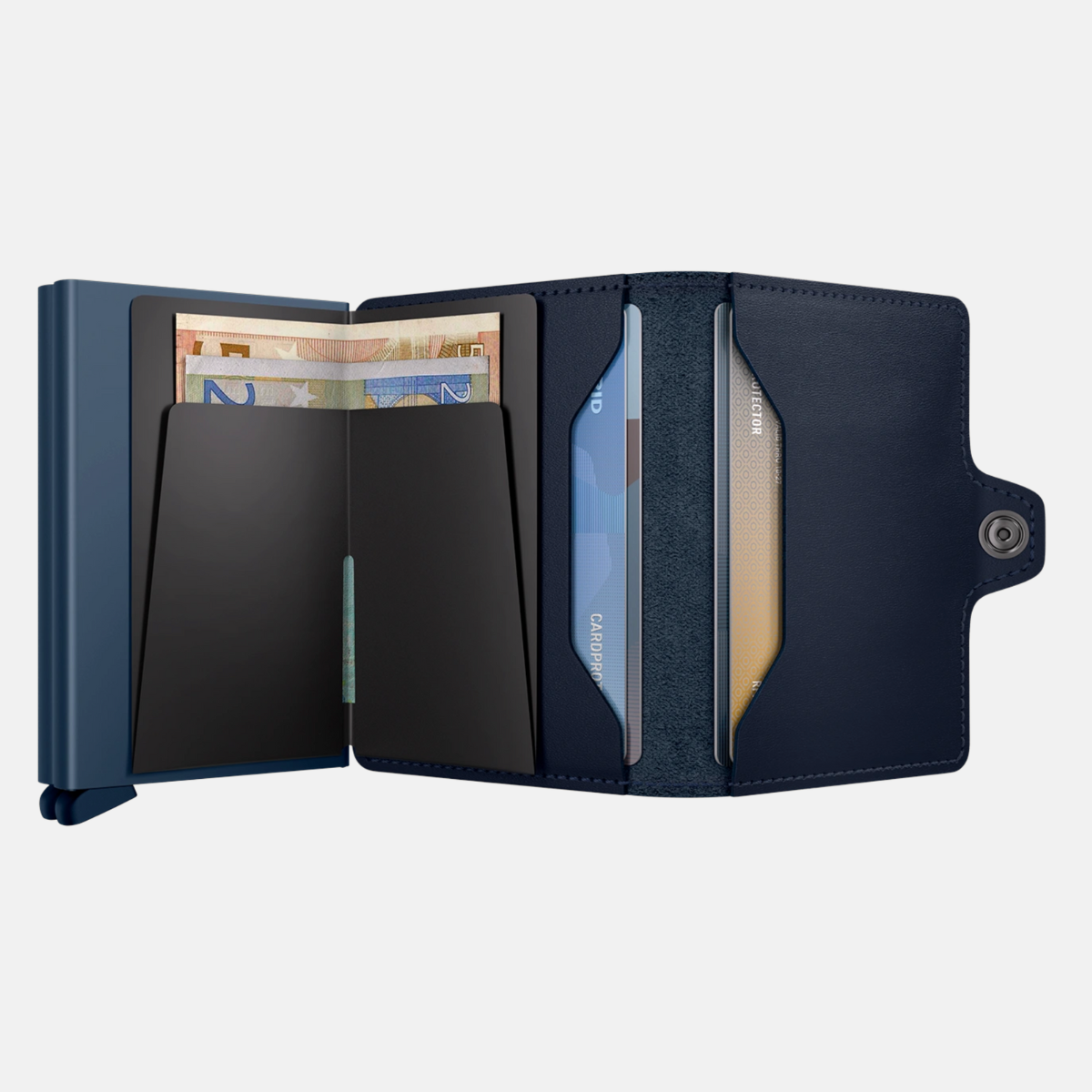 The patented mechanism allows you to slide out your cards with one simple motion, ready for immediate use. The aluminium protects from bending, breaking and unwanted wireless communication. Miniwallet Original is corrected-grain leather, made in Holland and Italy from European cowhide.