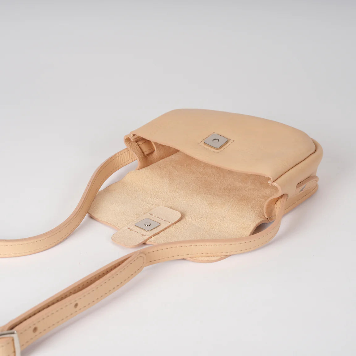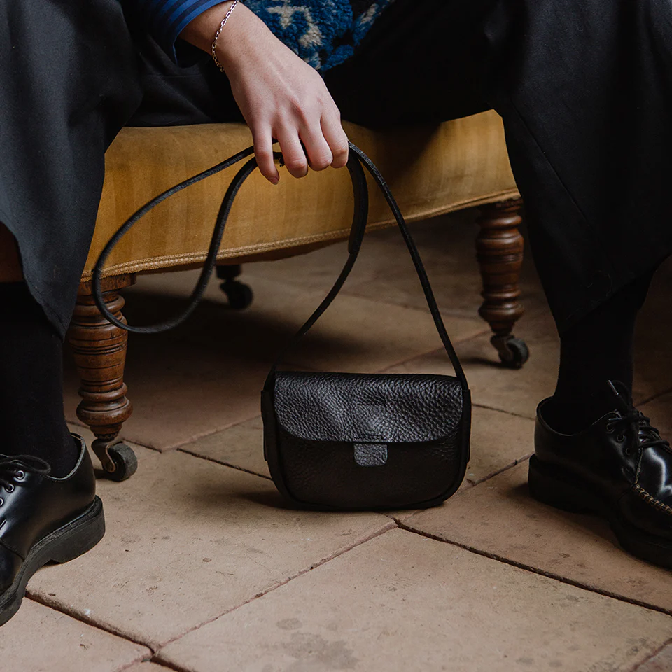 The mini tab bag is one of our best-selling small bags perfect for everyday essentials, also great paired with one of our Giga Totes for travelling. Made from tumbled Italian vegetable tanned leather. Unlined with a magnet tab closure. Sits comfortably on the shoulder with a slim adjustable buckle strap.